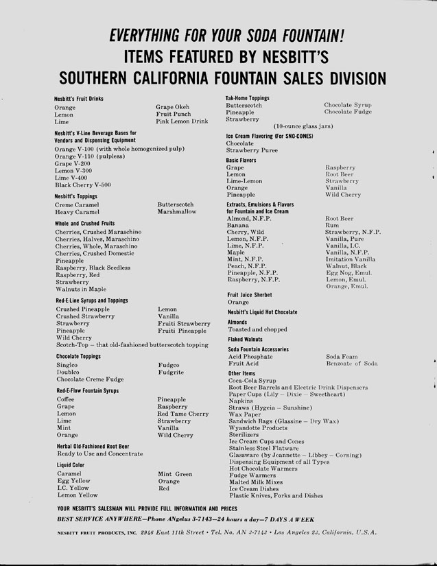 The Nesbitt Fruit Products Company was founded in 1924 by Hugh S. Nesbitt. The company produced syrups to be used in soda fountains. The company produced a full line of fountain products through the years including various fruit flavors to be mixed with soda water, toppings for ice cream, including chocolate, hot fudge, crushed pineapple and strawberrys, and, a hot chocolate base. They also marketed branded dispensers and other fountain supplies (see 1959 fountain list). The original plant,occupied in 1925, was located at: