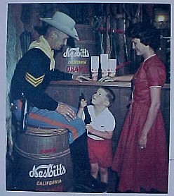 Nesbitt's was the sponsor of an early television show in Los Angeles called "Ricky and the Magic Trolley." It was a puppet show that was done circa 1952-1953. I remember going to the set with my grandfather when I was 6 or 7 years old along with my two younger sisters.  We went to do a live TV commercial with a couple of other kids who were the daughters of the Nesbitt ad agency guy.  It was in the same studio as "Space Patrol," one of my favorite TV shows at the time.  I was thrilled to sit in the cockpit of the space ship. The Ricky puppet show set was raised off the floor so the pupeteers could stand up under it.  When I stood on a box and looked over the top edge of the set a real snake that was in a little pond on the set popped it's head up out of the water right in front of my face and I fell back off of the box.  That same night us kids did a live TV commercial for Nesbitt's.  On cue we were all supposed to take swig of Nesbitt's Orange and then say "uuum good."  I remember my sister blowing the cue by doing it too early.  I remember the images from that day vividly.  Click here to see postcards that were sent to fans who wrote the show. Thanks to Gary Frank for sharing these with me.